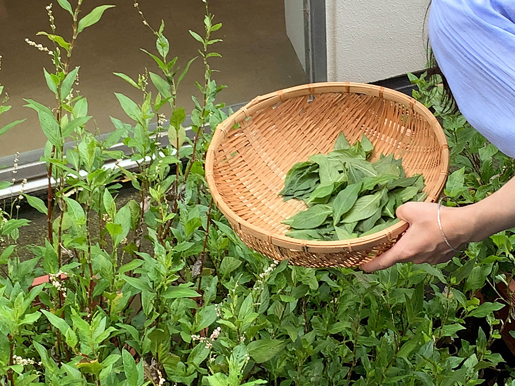 空の下、葉を摘む作業もちょっとした収穫体験のようで気持ちいいです。