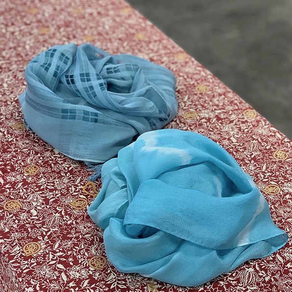 単色での染めなので、生地を板で挟み込んだり、結ぶ(絞る)ことによって、染色液に浸けない白い部分を残すことで柄をつくります。