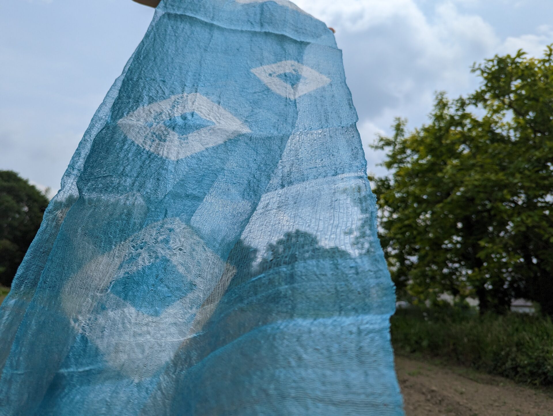 単色での染めなので、生地を結ぶ(絞る)ことによって、染色液に浸けない白い部分を残すことで柄をつくります。