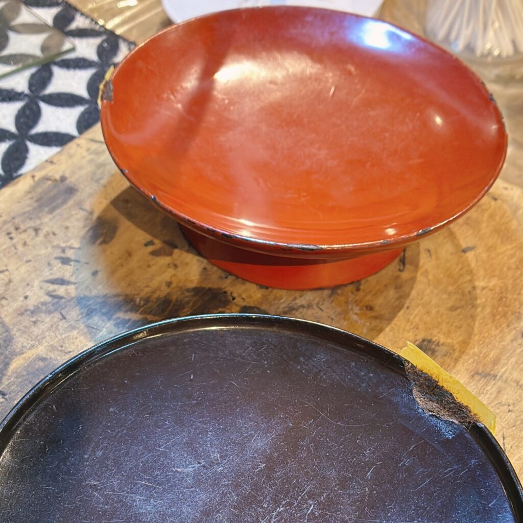 大部分の器はあまり使われていないのか、綺麗なままです。一部には欠けたり、禿げたりしたものもありますが、そこから木地の様子が見てとれるのは、古物ゆえに逆に安心材料だったりもします。