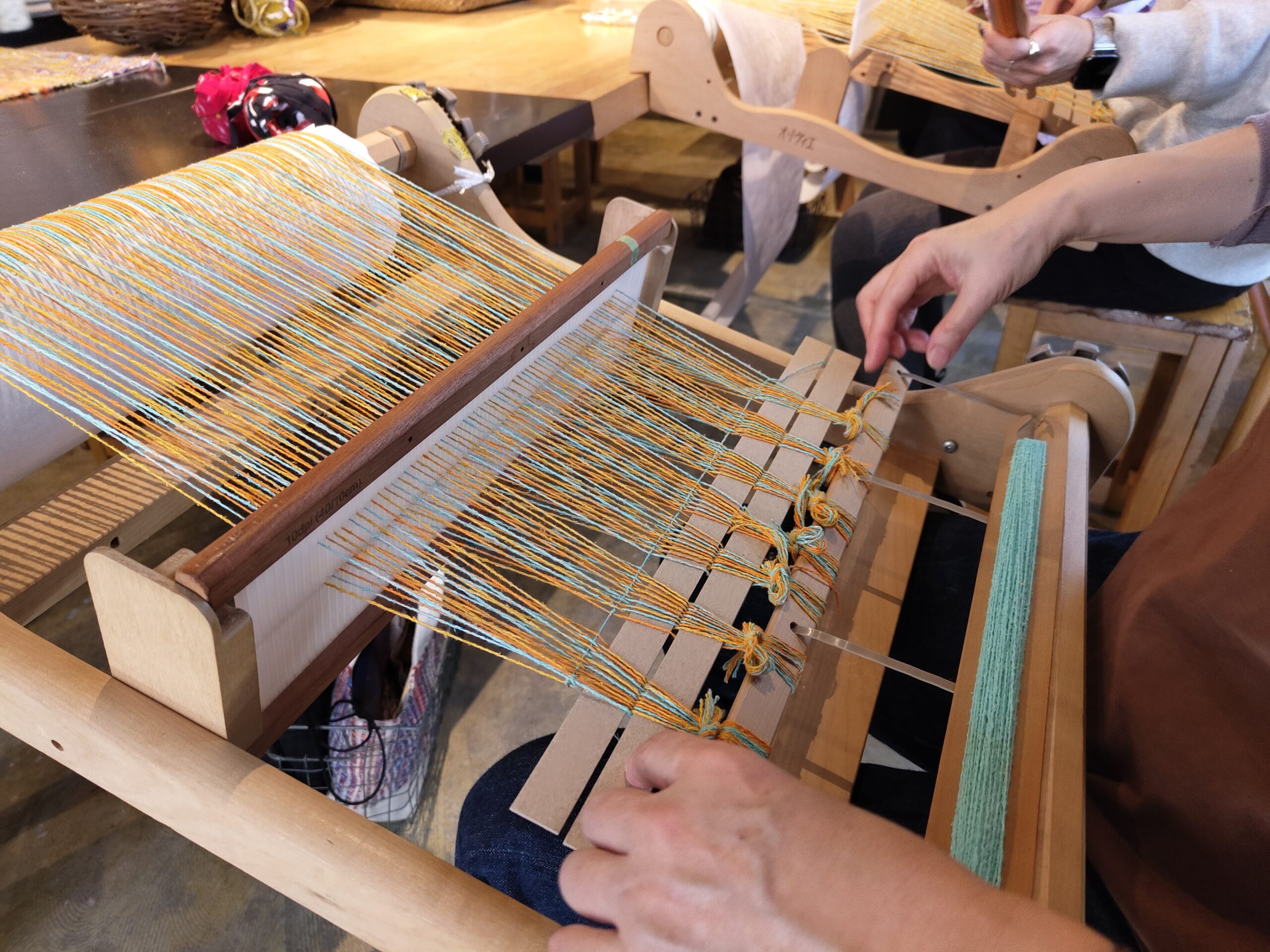 こちらの板杼(いたひ)という道具に布を巻きつけて、お好きな柄を選んで織っていきます。派手かわいくも、ナチュラルにも、生地とその組み合わせ次第で。