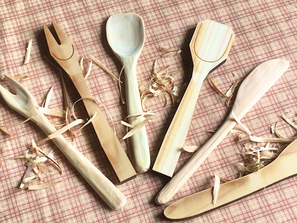 そしてワークショップでは、自分で作ってつくる木のカトラリー「ヒトテマキット」の中からお好きなモノを選んで、その場で語らいながら、お気の済むまでシュルシュルと削りましょう。