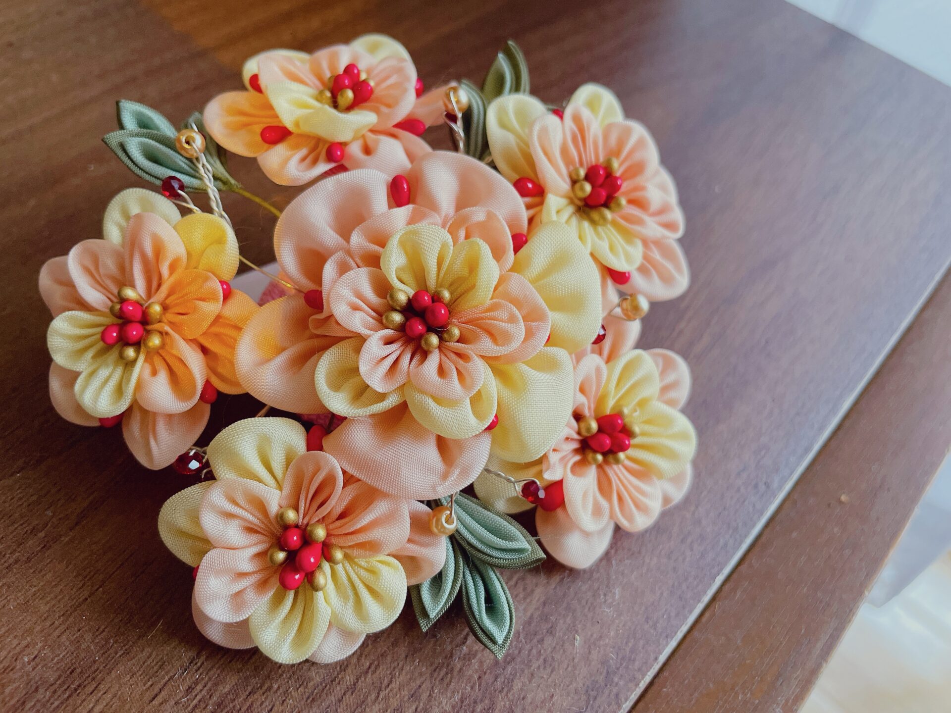 つまみ細工の簪やコサージュなどは、もちろん七五三や成人式、結婚式にもご使用いただけますし、普段使いにもってこいの作品もご用意してます。これからだと、お祭りや夏の装いにもぴったりですね!