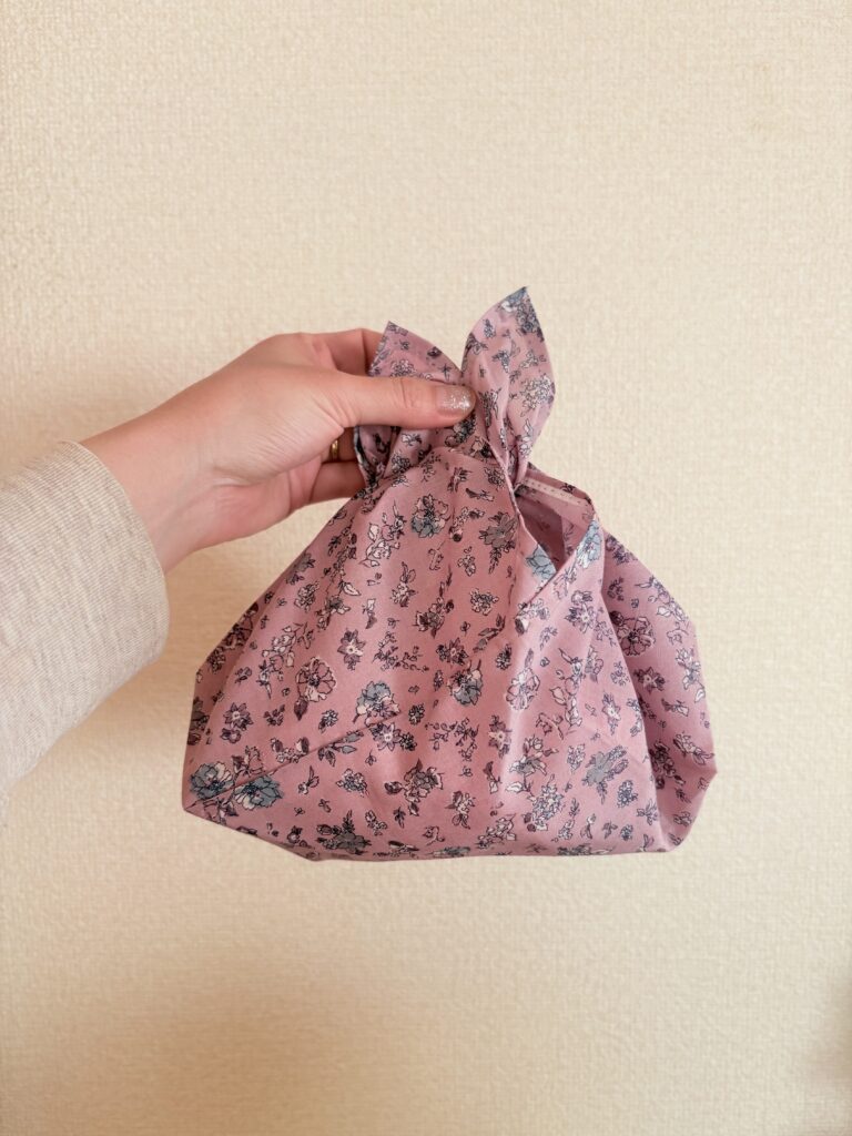 お弁当サイズの小さめあずま袋は、ぎゅっと結んでみるとこんな感じ。丸いフォルムが何ともかわいいです◎