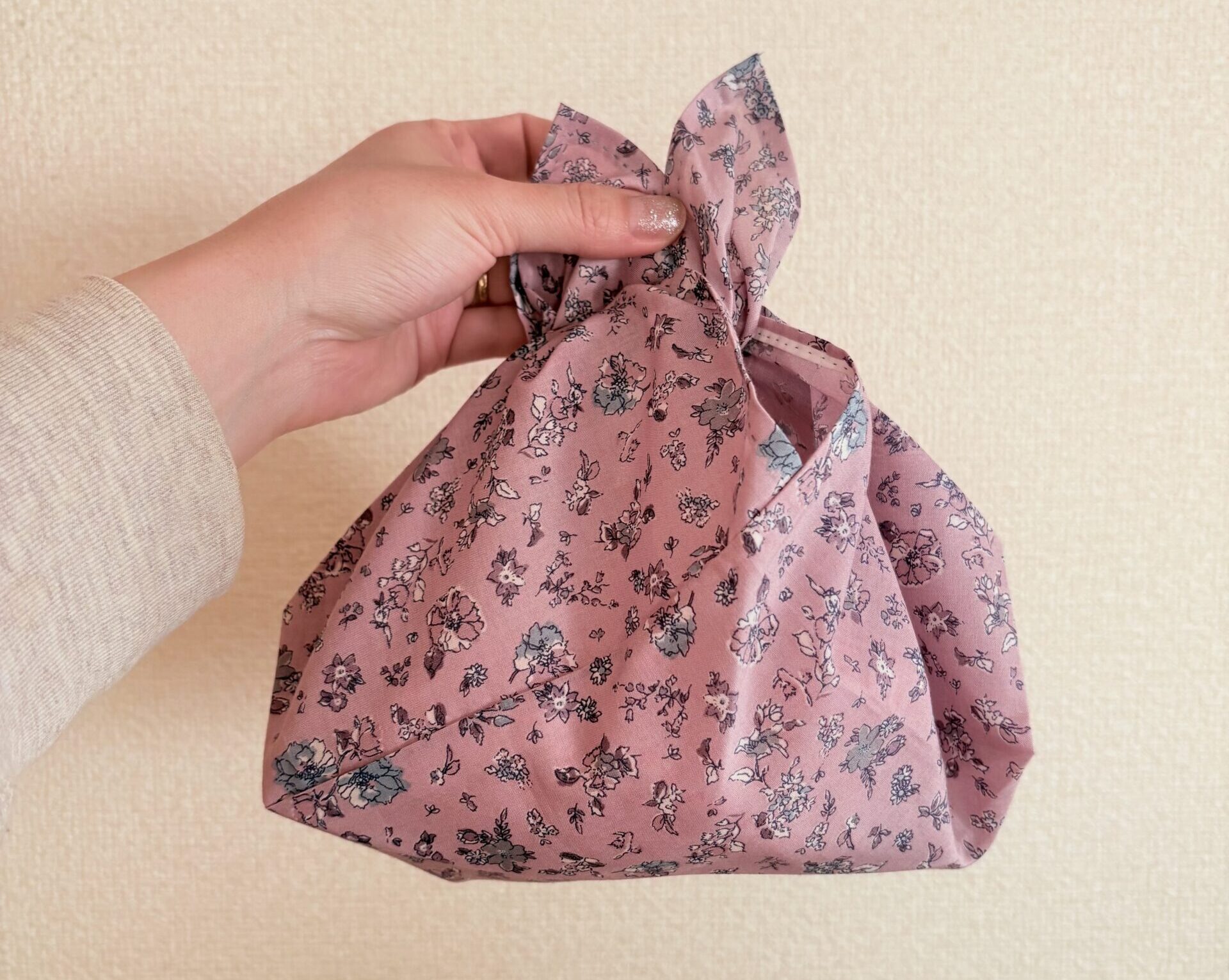 お弁当サイズの小さめあずま袋は、ぎゅっと結んでみるとこんな感じ。丸いフォルムが何ともかわいいです◎