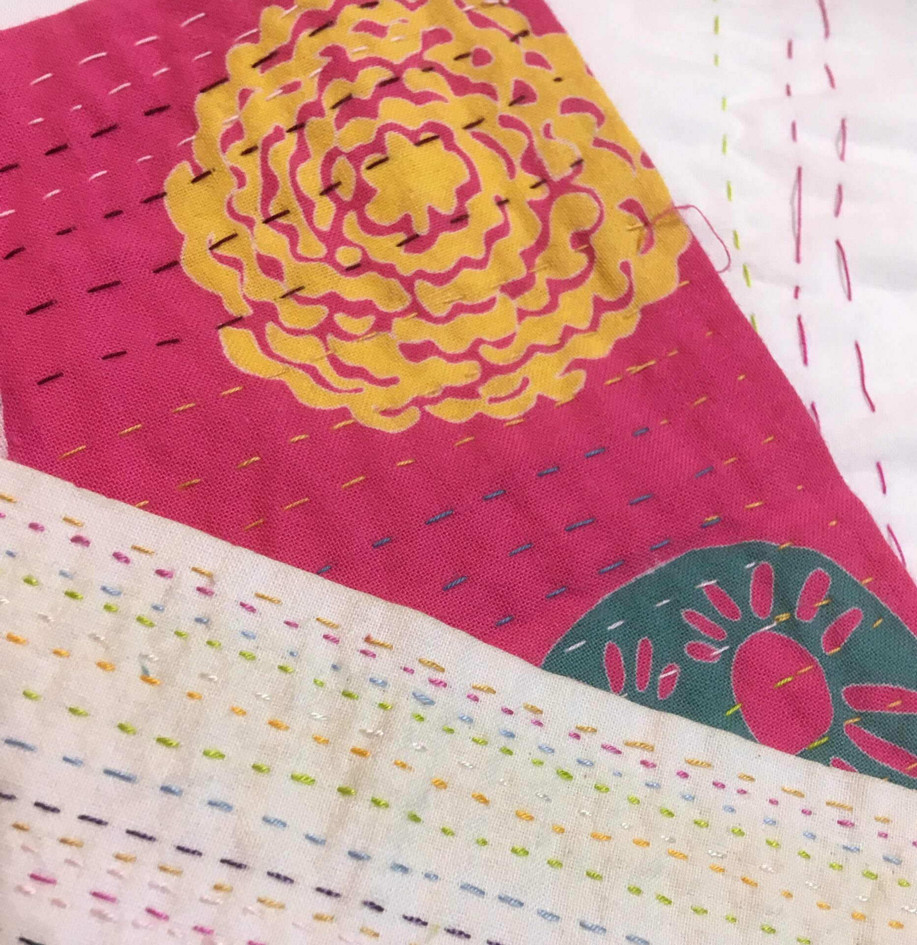 にじゆらさんの可愛い手ぬぐいの上に、自分でチクチクと一針ずつ縫い進める。ワークショップが終わったときには、運針の技術と、愛着あるふきんが手に入ります。
